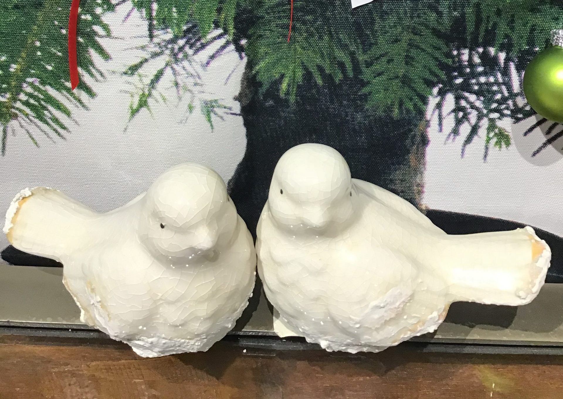This set of 2 decorative white ceramic birds are a great addition to your holiday table! Each has painted snow on them to add a little bit of winter to these adorable table sitters. Not recommended for outdoor use. 3.5″ L x 3″ H
