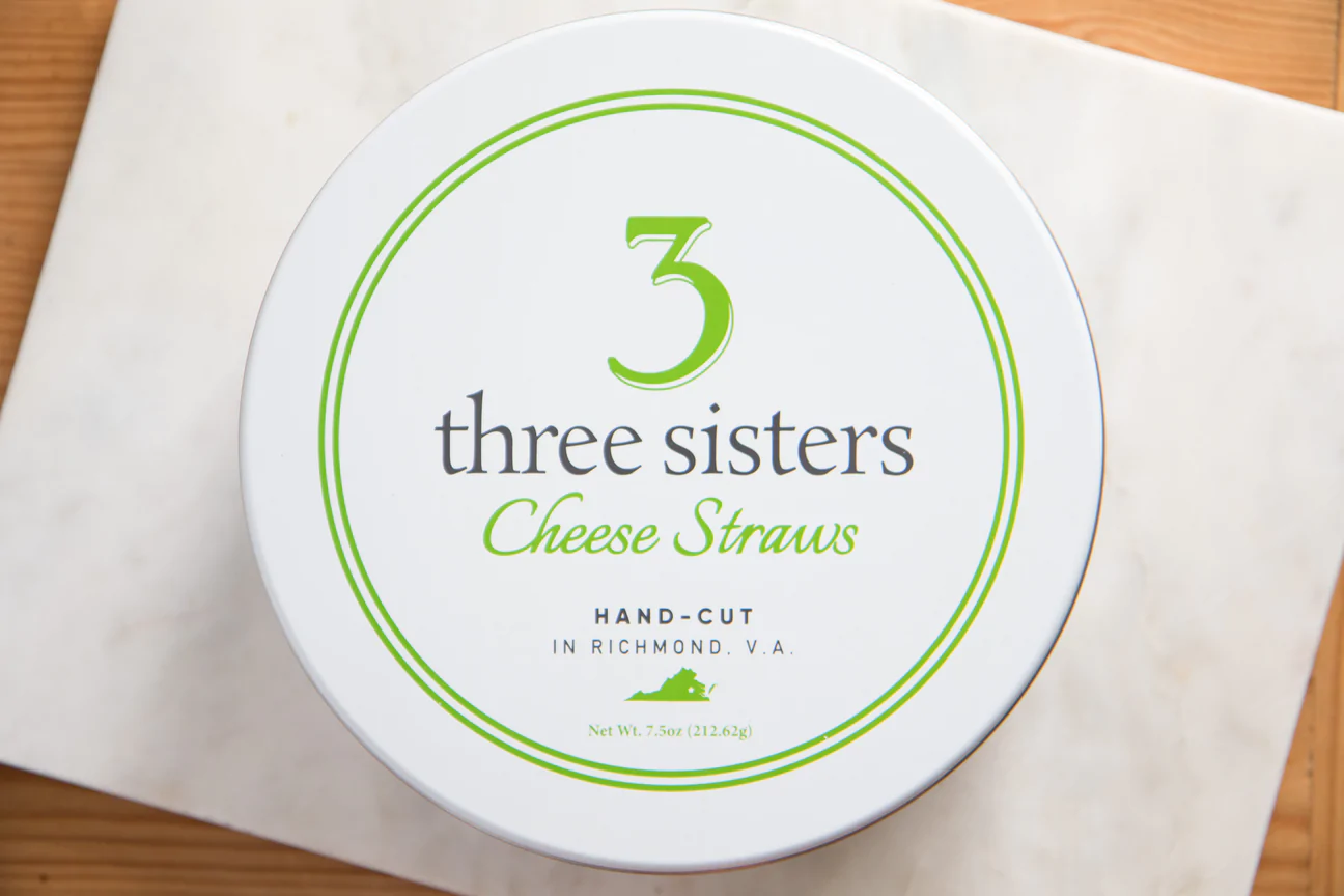 Three Sisters traditional Cheddar Cheese straws are delicious and have just the right amount of kick! Made locally in Richmond, VA. Please enjoy within 4 months or they can be frozen up to a year. Each tin contains 8oz of our Cheese Straws.