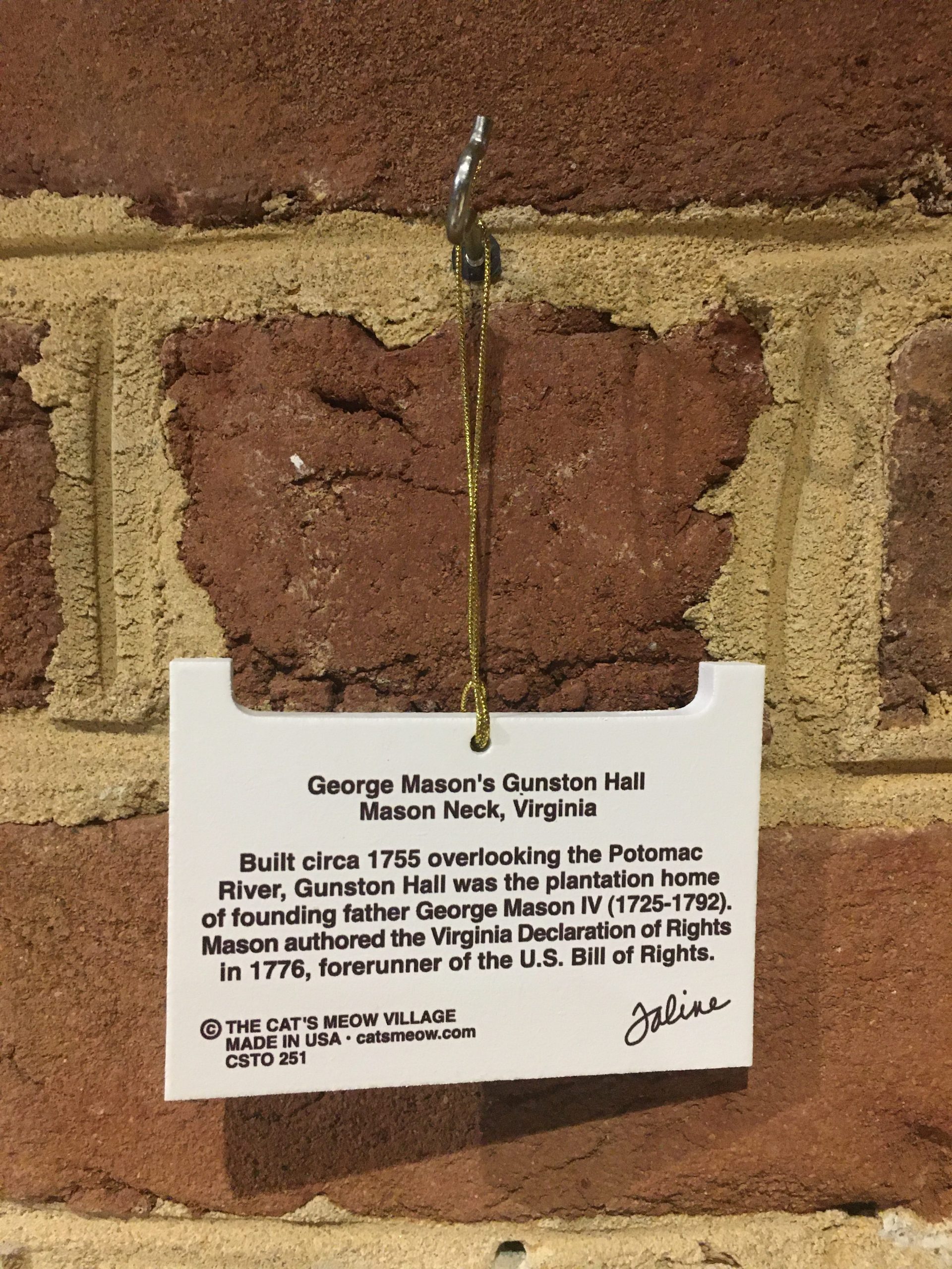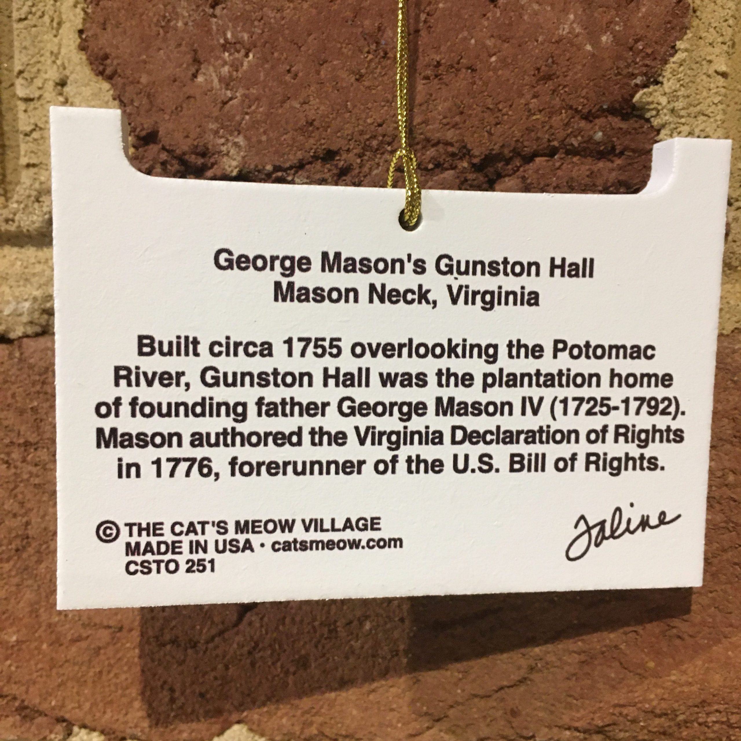 Bring home a piece of history with this custom Cat’s Meow wooden ornament of Gunston Hall. The front showcases the elegant façade of George Mason’s historic home, while the back includes a brief history of the estate and its significance. With an attached gold ribbon, this ornament is perfect for hanging on a Christmas tree or displaying year-round as a keepsake.